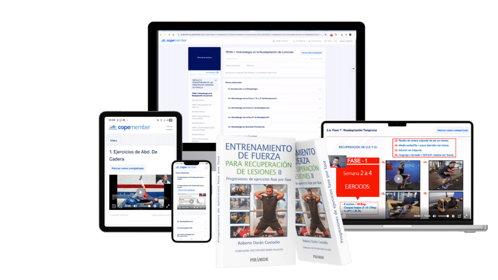 Talleres presenciales opcionales y uso de herramientas profesionales (hidrocinesia, fuerza aplicada, termografía, isocinético, etc.) para dominar la readaptación en contextos reales.